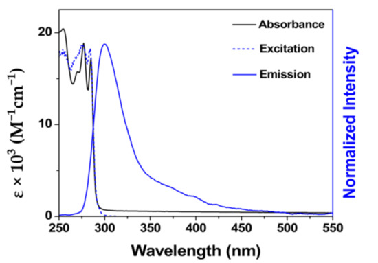 The BimOEt3 ligand was synthesized following literature reports [20,21,26,27] and the successful synthesis was confirmed by a combination of 1H and 13C NMR spectroscopy (Figures S1–S3). Investigation of the photophysics of BimOEt3 in ethanol via UV–Vis absorption and fluorescence spectroscopy showed three absorption bands (253, 277, and 285 nm) and emission maxima at 322 nm that were attributed to singlet 1π→1π* and 1π*→1π transitions of the benzimidazole groups, respectively (Figure 1) [28]. The emission spectrum of BimOEt3 ranges from 300 to 500 nm with a maximum at 322 nm when excited at 280 nm (Figure 1). The measured absolute fluorescence quantum yield, φL–Ln, and the lifetime, τ, of BimOEt3 (ethanol, 298 K) were 8.1 ± 2.0% and 1.1 ± 0.1 ns, respectively.