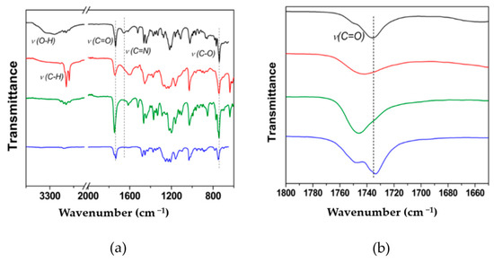 Infrared spectra of BimOEt3 (black trace), EuIII complex (red trace), TbIII complex (green trace), and CeIII complex (blue trace) with assignment of relevant vibrational frequencies shown in (a) full and (b) selected carbonyl stretching region.