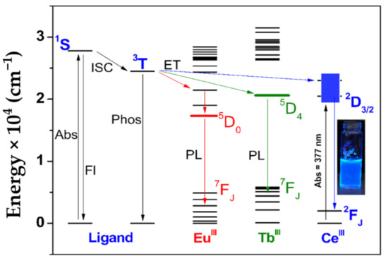 - Crosby, G.A.; Whan, R.E.; Alire, R.M. Intramolecular Energy Transfer in Rare Earth Chelates. Role of the Triplet State. J. Chem. Phys. 1961, 34, 743–748. [Google Scholar] [CrossRef]