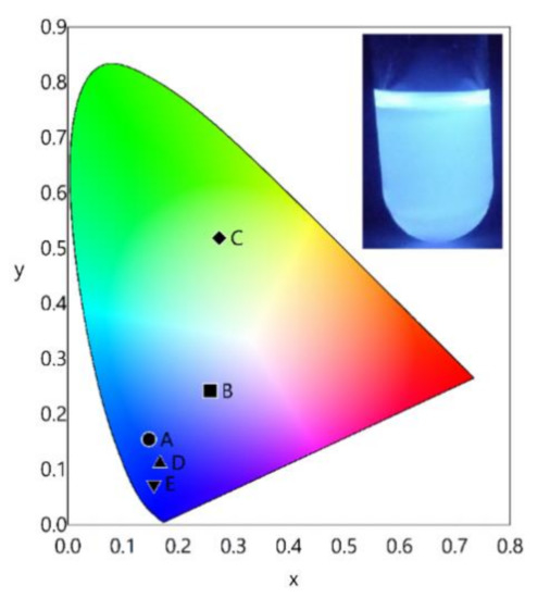CIE coordinate diagram of (A) BimOEt3 and its (B) EuIII complex, (C) TbIII complex, (D) CeIII complex at 280 nm excitation, and (E) CeIII complex at 377 nm excitation. The insert shows the intense bluish-white emission of the EuIII-BimOEt3 complex in ethanol under 365-nm UV irradiation.