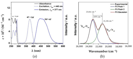 In contrast to the EuIII and TbIII complexes, excitation of the CeIII complex at 280 nm resulted in two broad emission bands that are attributed to the 1π*→1π transitions of the ligand and the 2D3/2→2FJ (J = 5/2–7/2) transitions of the CeIII ion (Figure 6a,b). In addition, another transition at 489 nm was observed in the CeIII emission spectrum and can be attributed to ligand perturbation of the CeIII ion [37]. Further analysis of the 2D3/2→2FJ (J = 5/2–7/2) transitions of the CeIII emission at 77 K revealed two distinct bands at 434 nm (23,041 cm−1) and 472 nm (21,186 cm−1) with a resulting energy gap of ~1900 cm−1, which is in agreement with previous reports (Figure 6b) [19,21,37].