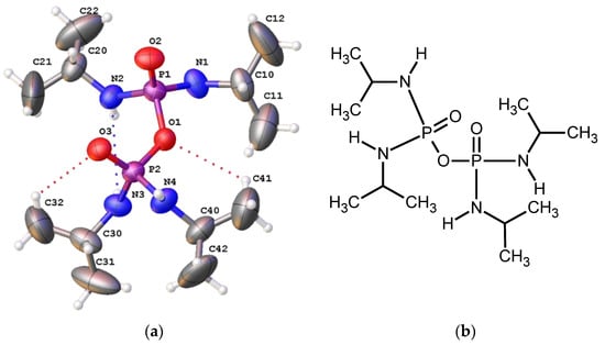 (a) Molecular structure obtained for O((iPrNH)2PO)2 the hydrogen bonding N3–H1···N2 (blue) and the weak hydrogen bonding observed as C32–H32A···O3 and C41–H41A···O1 (red)(generated using Olex2 [23]); (b) molecular diagram for O((iPrNH)2PO)2 (generated using ChemSketch [24]).