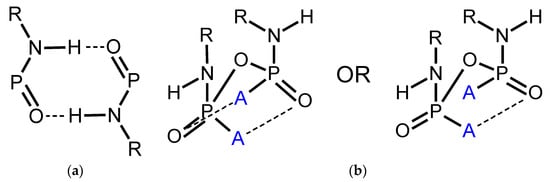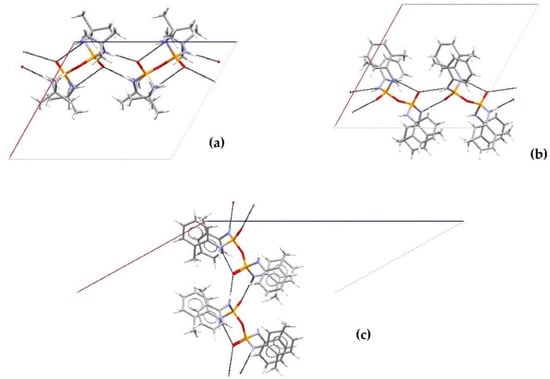 The mono-N-substituted pyrophosphoramides, which do not crystallise in the P21/c spacegroup, show different inter- and intramolecular hydrogen bonding motifs. Given that the compounds crystallising in the same spacegroup (P21/c) contain both alkyl and aryl moieties and show a different packing of these moieties, a similar observation is expected for the 4-methylphenyl and the iso-propyl analogues. However, a different supramolecular structure was formed by the 4-methylphenyl derivative O((4-MePhNH)2PO)2, crystallising in spacegroup Pccn [13]. There is no intramolecular synthon present (Figure 3b), resulting in a different pattern of supramolecular interactions. The phosphoryl oxygen and the amide nitrogen, which typically form the intramolecular P=O···H–N motif in the P21/c structures, do not show any hydrogen bonding and therefore, the molecules are not limited to an eclipsed conformation (vide supra). They form a staggered conformation that enables the formation of the basic supramolecular building block for this structure. Two molecules are connected via two intermolecular P=O···H–N hydrogen bonds, forming a ring synthon with graph set (Figure 8) [13,19]. Further N–H···Ph and P=O···H–C(Ph(C2)) interactions are observed. The N–H···Ph interactions are formed through the remaining amide moieties which do not interact in the ring described prior and this additional set of interactions seems to stabilise the motif by increasing the packing efficiency and stopping this moiety from forming the previously mentioned intramolecular P=O···H–N bonding. The P=O···H–C(Ph(C2)) interactions also seem to add stability by further aiding the P=O oxygen atoms to obtain the orientation necessary to form this synthon [17,21].