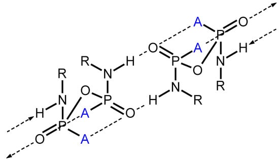 On comparison of the crystal structures of the compounds classified in each group, the most important molecular difference that seemed to affect the supramolecular structure was the presence of the N–H moiety. Its presence caused a significant difference between the structure of the mono-N-substituted pyrophosphoramides and the di-N-substituted pyrophosphoramides, which lack this moiety. In the crystal structures of mono-N-substituted pyrophosphoramides P=O···H–N hydrogen bonds were the most prominent and common intermolecular bonds in the structure. These formed numerous intermolecular and intramolecular synthons, which were the primary cause for the formation of the various supramolecular motifs observed, and which dictated both structure and symmetry [17,18,19]. The di-N-substituted pyrophosphoramides were shown to form crystalline structures wherein the pyrophosphoramide moieties did not interact with each other directly. Thus, no strong intermolecular interactions were found. The organic moieties therefore had a significant impact on the packing of molecules in the crystal structures obtained in contrast to the mono-N-substituted pyrophosphoramides (Table 3).