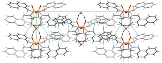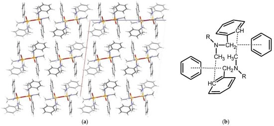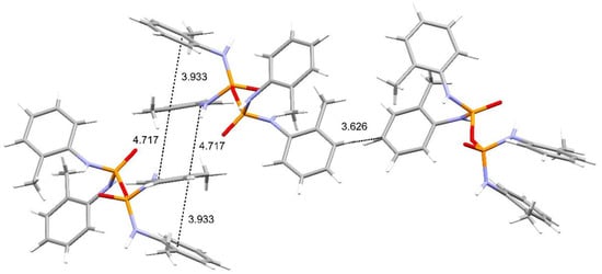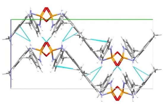 The two molecules are related by a glide plane on the a–c plane along the c axis (Figure 9) which results in the formation of infinite chains along cell axis c. Neighbouring chains positioned anti-parallel to each other along the b axis and related to each other by a second glide plane along the diagonal of the ab plane. Chains neighbouring each other along the a axis are parallel and again related by translation. The main interaction responsible for arrangement in antiparallel chains is the Ph(π)···H–C(para-methyl) interaction between the closely situated 4-methyphenyl groups bound to different molecules in different chains [21], as noted in Figure 9 [13]. This guarantees the closest possible packing of the various phenyl groups in the molecule. Thus, the 4-methylphenyl groups seem to play a structure forming role in both the formation of a different hydrogen bonding motif and a different packing of the molecules in this structure compared to other pyrophosphoramides.