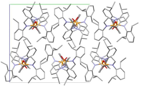 The crystal structure of O((C2H4(2,5-iPrPhN)2)2PO)2 shows only very weak intermolecular interactions [14]. The pyrophosphoramide moieties seem to be isolated from each other by the bulky hydrophobic organic moieties (Figure 13).