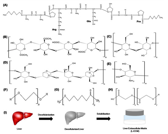 Schematic showing structure of different polymers used as bioinks. (A) Gelatin, (B) alginate, (C) cellulose, (D) agarose, (E) chitosan, (F) polyethylene glycol, (G) polycaprolactone, (H) poly(lactic-co-glycolic acid),(I) decellularized matrix (n—repeating unit of polymer; x—first repeating unit and y—second repeating unit of same polymer. All figures were drawn in software ACD/Chemsketch (freeware), Toronto, ON, Canada, Version 2020 1.2.