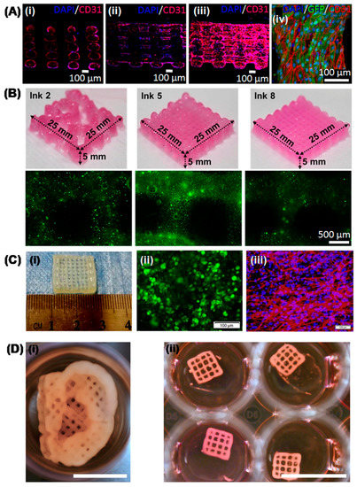 Three-dimensional bioprinted tissue constructs using polymeric bioinks. (A) Confocal microscopy images of a 1 mm thick bioprinted HUVEC construct using gelatin-based bioink. (i) transversal cross-section, (ii) longitudinal cross-section, (iii) outer surface of the complete construct. (iv) Top view of a single fiber immunostained for CD31 (red) and DAPI (blue). Scale bar: 100 µm; GFP: Green fluorescent protein. Image reproduced with permission from [45]. (B) Upper panel: digital image of 3D bioprinted structures using alginate-based inks. Lower panel: fluorescence images of WST-1 cells printed in the alginate-based bioinks after 7 days of culture. Scale bar: 500 µm; green: live cells. Image reproduced with permission from [73]. (C) Three-dimensional bioprinted structure using collagen-alginate bioink. (i) Digital image. (ii) Fluorescent image showing viability of bioprinted rat primary chondrocytes by Calcein-AM staining. (iii) Fluorescent image showing cytoskeleton morphology of bioprinted rat primary chondrocytes by rhodamine–phalloidin (Red)/Hoechst 33,258 (Blue) staining. Scale bar: 100 µm. Image reproduced with permission from [63]. (D) Three-dimensional bioprinted structure using nanofibrillated cellulose-based bioink. (i) Auricular and (ii) lattice structured construct with human nasal chondrocytes after 21 days of culture. Scale bar: 1 mm. Image reproduced with permission from [67].