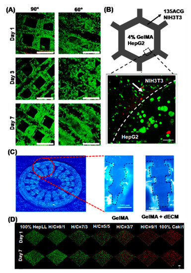 Three-dimensional hepatic printing with polymeric bioinks. (A) Confocal images of live/dead (green/red) staining of Huh7 cell seeded structures of different angles over 7 days (Magnification: 10 X; Scale bar: 500 µm). Image reproduced with permission from [79]. (B) Adjacent NIH/3T3 in 1% alginate, 3% nanocrystalline cellulose and 5% GelMA (135ACG) and HepG2 in 4% GelMA on day 7 (green: live cells; red: dead cells; Scale bar: 100 µm) Image reproduced with permission from [87]. (C) The macroscopic images of the digital light process printed GelMA/dECM and GelMA scaffolds in inner gear-like design (Scale bar: 500 µm). Image reproduced with permission from [88]. (D) Confocal images of liver (HepLL) and kidney (Caki-1) cells co-cultured on metastasis-on-a-chip on day 1 and day 7 (Scale bar: 100 μm). Image reproduced with permission from [96].