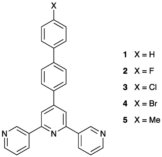 - Constable, E.C.; Housecroft, C.E.; Neuburger, M.; Schönle, J.; Vujovic, S.; Zampese, J.A. Molecular recognition between 4′-(4-biphenylyl)-4,2′:6′,4″-terpyridine domains in the assembly of d9 and d10 metal ion-containing one-dimensional coordination polymers. Polyhedron 2013, 60, 120–129. [Google Scholar] [CrossRef]