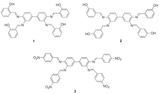 PVC (K-value = 67 and degree of polymerization = 800) was purchased from Petkim Petrokimya (Istanbul, Turkey). Schiff bases, numbered 1–3, were prepared by following procedure from the literature and used as PVC photo-stabilizers [] and thermal-stabilizers. Biphenyl-3,3′,4,4′-tetraamine was condensate with four mole equivalents aromatic aldehydes, namely 2-, 3-hydroxybenzaldehyde, and 4-nitrobenzaldehyde. The synthesis process was conducted in ethanol, catalyzed with acetic acid, and maintained under reflux for 4 h. Figure 1 shows the structure of the prepared 1–3 Schiff bases. More details regarding these components’ characterizations and properties were described in our previous work [].