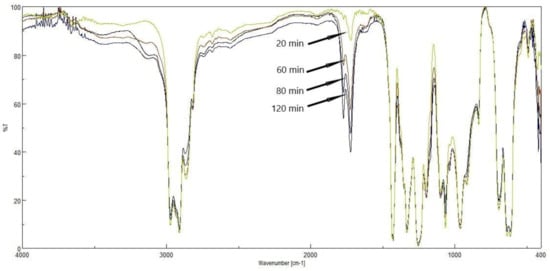In regard to studying the interaction and change that occurred between PVC chains and thermal stabilizers, FTIR spectra of PVC were investigated to detect the characteristic bands. PVC films showed bands around 1722 and 688 cm−1, which were assigned to C=O and C-H groups, respectively []. The intensities of the C=O peak vibration was compared to a reference peak (1328 cm−1, C–H bond vibrations). The FT-IR spectra reflected from blank PVC specimens during oven aging are shown in Figure 2. From the figure, the peak at 1722 cm−1 resulted from C=O (carbonyl) moiety vibrations. This peak’s intensity increased during oven aging, where the highest value was obtained after 120 min.