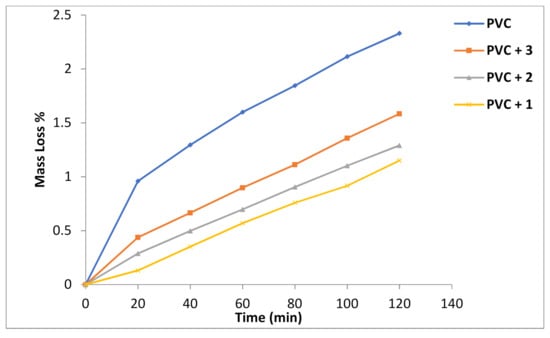 The dehydrochlorination of PVC polymer occurs at high temperatures and leads to a loss in the polymeric material due to the elimination of hydrogen chloride []. Such a process also leads to the evolution of volatile toxic pollutants and discoloration of the polymeric material. The use of Schiff bases 1–3 can stabilize the PVC against oven-aging degradation. PVC films were heated for a while, and the weight loss (%) was calculated every 20 min using Equation (1) [], wherein Wo is the film’s weight before heating and Wt is the weight at an appropriate time point.