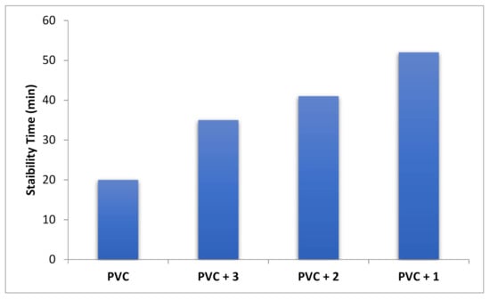 To measure the thermal stability of a polymer, the Congo Red test was conducted []. In this work, 2.5 g of PVC films were heated at 180 °C in air presence; the samples were placed in test tubes that have 2.0 cm Congo Red test papers above the samples. The estimated time to observe the color change from red to blue was assigned as the thermal stability (Ts) time.