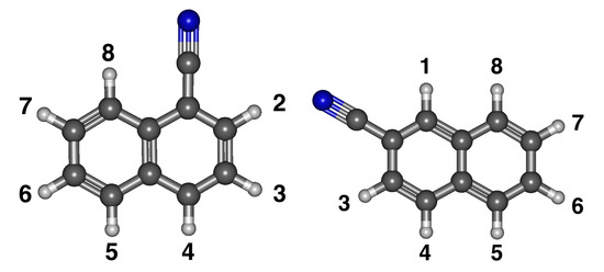 The optimized structure of both derivatives of cyanonaphthalene with numbered positions for deprotonation.