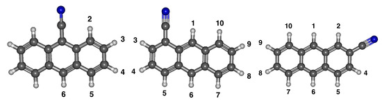 Figure 6 shows three various positions for the cyano group on anthracene. 1-cyanoanthracene only has six different anion/radical isomers due to C symmetry before deprotonation, but the others have ten distinct anion/radical isomers because of C symmetry. Similar to benzonitrile and cyanonaphthalene, the labels reference where the hydrogen is removed, and these positions are given in Figure 6.