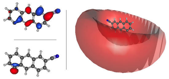 Interestingly, more transitions appear below the eBE when the cyano group is on the outer part of the rings. This is because the box, for the PIB analogy, gets longer, which increases the probability of the excitations falling underneath the eBE due to the smaller energy separations between states. Similar to 1-cyanonapthalene, anions 3, 6, and 7 have valence transitions. Figure 5 shows both the valence and dipole bound orbitals of anion 7. The far left is the HOMO lone pair, the valence state is next to it, and the dipole bound state is on the opposite side. The valence and dipole bound states for anions 6 and 7 have similar topologies as in Figure 5. These excitations are in the wavelength range of 470–553 nm; 24 unknown DIB peaks fall within this range [83]. Furthermore, anion 6 is the most stable anion, making it the most likely to exist in astrophysical regions where DIBs may be observed, and has both a dipole bound and valence excitation. The 1 A and 2 valence and dipole bound excited states, respectively, for anion 6 are 2.2851 and 2.1070 eV, corresponding to wavelengths of 543 and 544 nm. Similarly, there are unidentified DIBs peaks at 541.84 and 544.96 nm. Additionally, the oscillator strength for the valence state of anion 6 is actually on par with that for the dipole bound state in this instance both on the order of implying a possible additional significance for the valence 2 state in this instance. There can be no conclusion made that these are possible DIB carriers, but, in the least, a notable coincidence is present.