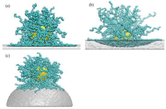 Numerous experimental and theoretical studies have been performed on understanding the equilibrium as well as the transient behavior of PGNs [31,32,33,34]. Beside the chemical properties of the polymer chains, nanoparticle and the targeted surface, the size of the nanoparticle, polymer grafting density and polymer chain length are among the parameters that determine the surface adhesion properties of the PGN. In addition to the properties of the polymer grafted nanoparticles, the geometry and morphological properties of the surface onto which the particles are adsorbed also play an important role in the adhesion strength. In this study, we investigate the effect of surface curvature on the adhesion of a polymer grafted nanoparticle to the surface. The curvatures (essentially holes in or bumps on the surface) that we simulate, are about the size of the PGN. At this scale, and depending on the strength and the range of interaction potential, the surface geometry determines the amount of free space around the polymer chains and consequently the distribution of the polymer chains interacting with the surface. Our results show that among the three surfaces, the flat surface is the most energetically favorable surface that the PGN adheres to. In contrast, a bare nanoparticle is more likely to adhere to a concave surface, considering that it has a greater contact area compared to the flat and convex surfaces, as well as a lock and key geometry [28,35].