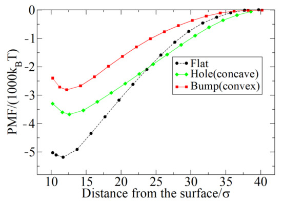 As can be seen in Figure 2, the system with the flat surface gives rise to the PMF with the deepest well, as compared to the convex and concave surfaces. Therefore, while it is thermodynamically more favorable for a bare nanoparticle to bind to concave surfaces due to a greater contact surface area as compared to flat and convex surfaces, the PGN is more likely to adhere to the flat surface [28,35], all other parameters in the systems being the same. This result means that by tethering polymer chains to a nanoparticle, we can completely change its binding properties to surfaces with different geometries.