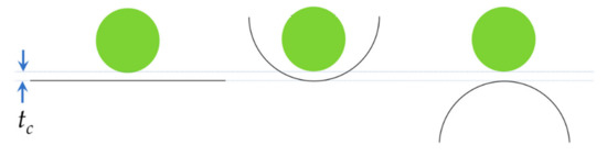 Schematic drawing of the nanoparticle on surfaces with zero, positive and negative curvatures. The region between the two dotted lines shows the thickness of the layer consisting of polymer chains confined between the nanoparticle and the surface, tc.