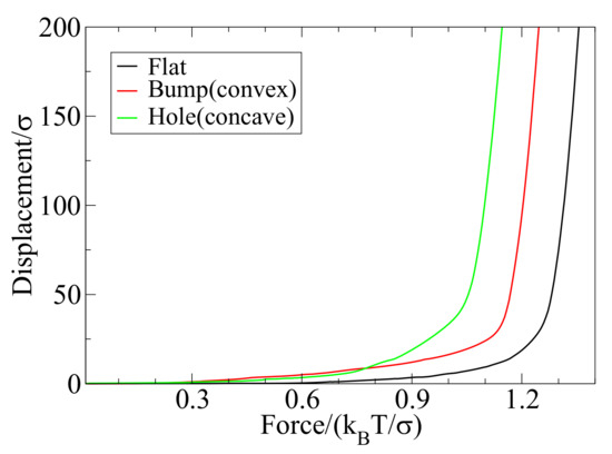 Force versus displacement of the center of mass of the nanoparticle for three systems under external force. The force increases at the same rate for each of the three systems. The sudden increase of displacement determines where the separation of the deformable polymer-grated nanoparticles from the rigid attractive surface occurs. While according to the results depicted in Figure 2, the adhesion of the nanoparticle to the surface with the hole is stronger than to the surface with the bump, due to the conformation of polymer chains confined between the nanoparticle and surface, the separation occurs at a smaller force for the nanoparticle in the hole.