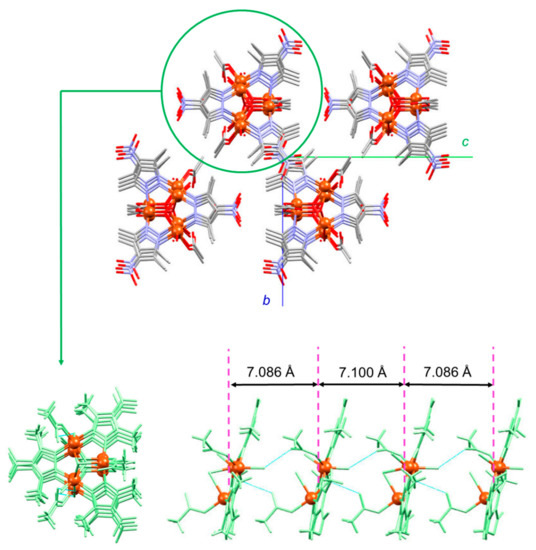 All reagents were of analytical grade, being used without further purification. 3,5-dimethyl-4-nitro-pyrazole (dmnpz) was synthesized according to literature procedures [33,34,35]. The content in carbon, hydrogen and nitrogen was determined by elemental analysis using a Perkin Elmer PE 2400 analyzer (Perkin Elmer, Boston, MA, USA). The IR spectra were performed by a JASCO 4200 spectrometer with Pike ATR unit in the 400–4000 cm−1 range (JASCO, Tokyo, Japan). The magnetic data were collected in the range of 2–300 K at an applied field of 0.1 T on a MPMS-5S SQUID magnetometer (Quantum Design, San Diego, CA, USA). The diamagnetism was corrected by Pascal constants [36].