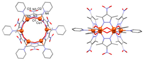 Performing the reaction with the same starting materials, but changing the solvent with a more basic one, pyridine, the [Cu6(µ-OH)6(µ-dmnpz)6(Py)6]·6Py·2EtOH (2) compound was obtained. The neutral complex belongs to the class of six-membered metallacycles, several known analogs being: ([{Cu(μ-OH)(μ-R1,R2-pz)}6], R1 = R2 = H [19,20], R1 = CH3, R2 = H [21], R1 = CH3, Py, R2 = H [22], R1 = CF3, R2 = H [23,24]. The six-membered rings with unsubstituted pyrazole ligands adopt a crown structure, with a cis arrangement, where the six hydroxyl groups of the metallacycle are pointing towards a focal point on an approximate symmetry axis, while the pyrazoles towards the periphery, the ensemble with, consequently, hydrophilic and hydrophobic domains. For substituted pyrazole, or for higher nuclearities of the metallacycles, the crown structures are sketching a trans arrangement with half of the OH groups and half of the pyrazolato ligands oriented on the same side, with respect to the mean plane of the metal-ions ring, while the other subsets of these ligands are placed on the opposite hemispace.