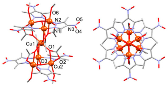 The triangular copper complexes with a hydroxy- or oxo-trinuclear bridge were obtained usually by the pyrazole deprotonation in the presence of a base [16,17,18], while in the case of using carboxylates copper salts, the pyrazole deprotonation is favored by the presence of carboxylate ions. Our compound 1 parallels literature results in terms of synthetic procedures and outcomes [26,27].
