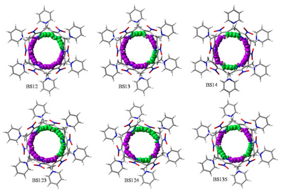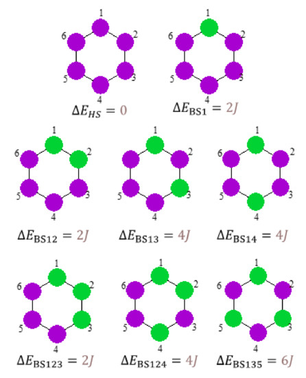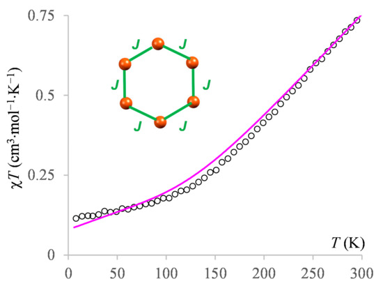 The fit (see Figure 7) demands empirical adjustment with paramagnetic impurity, since the χT values are not dropping to zero at low temperatures, as expected from the antiferromagnetic six-spins system and also a TIP term, to account for a slope in the interval to about 100K, instead of the plateau expected due to large absolute value of the coupling. As will be debated later on, the large coupling is expected from computational hints and also from precedent reported data on comparable systems [64]. We obtained the following fit parameters: g = 2.1, J = −310 cm−1, PIM = 0.08 cm3 mol−1 K−1, TIP = 0.00011 cm3 mol−1 K−2. The above cited work obtained an even larger antiferromagnetic coupling, J = 650 cm−1. The larger absolute value can be correlated with shorter Cu–Cu distance in the previously reported system, about 3.07 Å, in comparison with our spacing, at 3.32 Å. Probably, the positive sign reported by cited authors is a printing error, since according to their data and discussion, the system is recognized as antiferromagnetic, while using the same spin Hamiltonian as in Equation (17). The mentioned work [64] used the Magpack code for fit [65]. Since here we are making explicit the energy levels (see Supplementary Materials, Table S6), we bring further insight to the particularities of hexagonal six-spins systems.