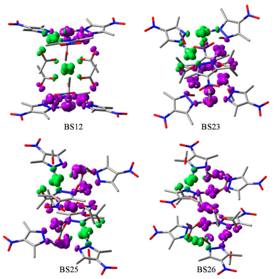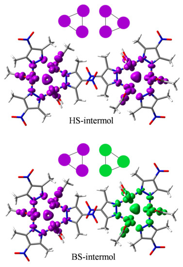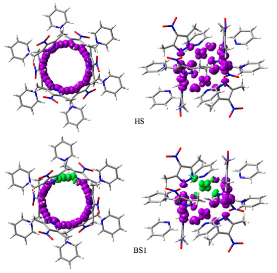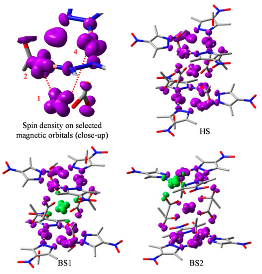 The so-called Broken Symmetry (BS) approach [71,72,73,74] represents the strategy usable to obtain estimations of exchange coupling parameters in the frame of Density Functional Theory. The BS-DFT calculations in compounds with many metal centers are laborious, since they are implying the obtaining of single-determinants with unrestricted localized orbitals, having a controlled spin polarization distribution on specific centers. Namely, they must drive the convergence toward defined maps, switching, by proper educated guesses, the local spin population on coordination sites between α or β preponderance. In this view, we proceeded by the following steps: (i) first, do the unrestricted calculation of the system with highest spin multiplicity (HS); (ii) collect the natural orbitals, emulating in this way a restricted-type result; (iii) perform an orbital localization, focusing on functions having singly-occupied nature; (iv) duplicate the sequences of restricted-type localized orbitals, as the initial guess for both α and β unrestricted subsets; (v) initiate the desired number of BS calculations operating the corresponding permutations in α and β orbital lists, in order to achieve the intended spin-flip scheme. The following Scheme 3, Scheme 4 and Scheme 5 should be regarded as a roadmap for the desired sequence of HS and BS calculations, customized by the described algorithm, while the subsequent Figure 8, Figure 9, Figure 10, Figure 11, Figure 12, Figure 13 and Figure 14, with spin density maps, can be seen as a confirmation for achieving the targeted patterns.