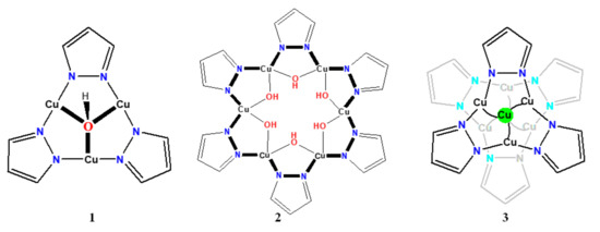 - Casarin, M.; Corvaja, C.; di Nicola, C.; Falcomer, D.; Franco, L.; Monari, M.; Pandolfo, L.; Pettinari, C.; Piccinelli, F.; Tagliatesta, P. Spontaneous Self-Assembly of an Unsymmetric Trinuclear Triangular Copper(II) Pyrazolate Complex, [Cu3(μ3-OH)(μ-pz)3(MeCOO)2(Hpz)] (Hpz = Pyrazole). Synthesis, Experimental and Theoretical Characterization, Reactivity, and Catalytic Activity. Inorg. Chem. 2004, 43, 5865–5876. [Google Scholar] [CrossRef] [PubMed]