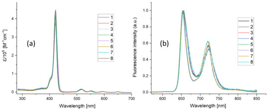 Figure 1a shows the absorption of 1–8. The spectra are very similar, regarding both the positions of the maxima and the transition intensities (Table 1). The similarity is also preserved in the emission (Figure 1b and Table 1). The fluorescence quantum yields are practically the same, given the experimental accuracy of about 20%. The decay times differ by less than 20%. It can be therefore assumed that the other spectral and photophysical characteristics, such as the energy of the lowest triplet state and triplet formation efficiency are also very similar in the whole series. In other words, modifying the structure of meso-tetra-p-tolylporphyrin by the substituents shown in Scheme 2 does not significantly affect the spectral and photophysical parameters. This is opposite to the behavior of the previously studied COT-substituted porphyrins shown in Scheme 1. In these molecules, placing the COT moiety very close to the porphyrin core resulted in spectral shifts in absorption and emission, as well as a decrease in fluorescence lifetimes and quantum yields [32].