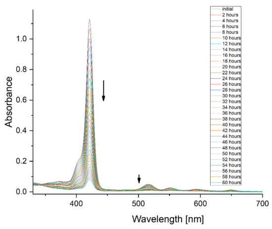 Changes in the absorption of porphyrin 1 observed upon irradiation. The sample was irradiated for 60 h, using an LED emitting at 420 nm (63 mW).