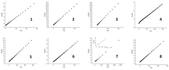It is known that the photodegradation of meso-tetraarylporphyrins in toluene occurs by different mechanisms in aerated and in deoxygenated solutions [36]. In the present work, we used “normal” conditions, that is, non-degassed solutions for the studies of photostability. However, triplet lifetimes were measured in both regimes, in order to separate the intrinsic and oxygen-induced rates of triplet decay (Table 1 and Table 2). Figure 2 shows the evolution of the spectra of porphyrin 1 observed upon irradiation. The absorption in the whole visible region gradually decreased, without the appearance of new bands. A rising absorption was only observed below 340 nm. Figure 3 shows the plots of A0/A(t) vs. F(t), from which the photobleaching quantum yields could be determined. Except for porphyrins 4 and 7, these plots are linear. Such behavior indicates that (i) there was no interference due to the absorption from species other than the substrate, and (ii) the photons from the light source used for irradiation were exclusively absorbed by the initial porphyrin during the whole experiment.