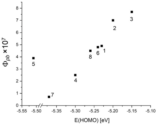The enhancement of photostability in 2,6-substituted meso-tetraphenylporphyrin derivatives has been observed and discussed before [42]. The authors concluded that “the steric effects in protecting the macrocycle seem to be predominant over the electronic ones”. In the present case, it may not be true, even though the steric effect is clearly seen. If thermodynamics, not kinetics, is the governing factor in photooxidation, one should expect the correlation between the photodegradation quantum yield and the ionization potential. As a measure of the latter, we used the calculated energy values of the highest occupied molecular orbital (HOMO). Their ordering was found to be in reasonable agreement with the ionization potentials estimated from cyclic voltammetry data (Table S2). Figure 4 shows that, except for one compound (5), the correlation between Φpb and E(HOMO) is indeed obtained. Porphyrin 5 reveals much lower photostability than expected from this correlation. We note that this is the only derivative with four COT moieties, which may suggest photochemistry involving the latter. It is supported by the finding that no correlation could be obtained between the photobleaching quantum yields and the HOMO values calculated for 1-H–4-H and 1-Zn–4-Zn.