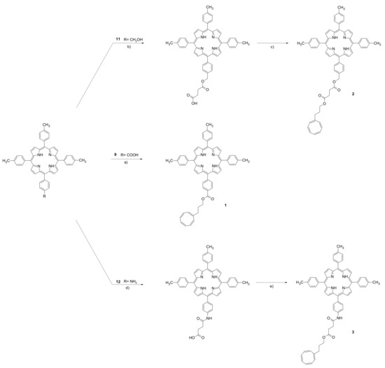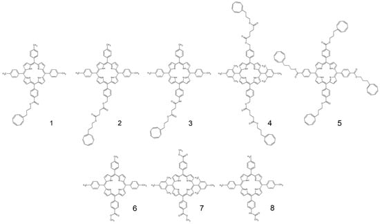 The syntheses relied on the standard convergent strategy employing appropriate porphyrin- and COT-containing building blocks, which were linked by an ester or amide bond using succinic or glutaric anhydride. We report the preparation of three new porphyrins covalently bonded with one COT moiety (1–3, Scheme 3) and two more (4–5) containing more than one COT moiety (Scheme 4). The triplet state quencher was spaced by 5 to 11 atoms away from the porphyrin core. The syntheses of 1–8 are described in more detail in the Supplementary Materials.