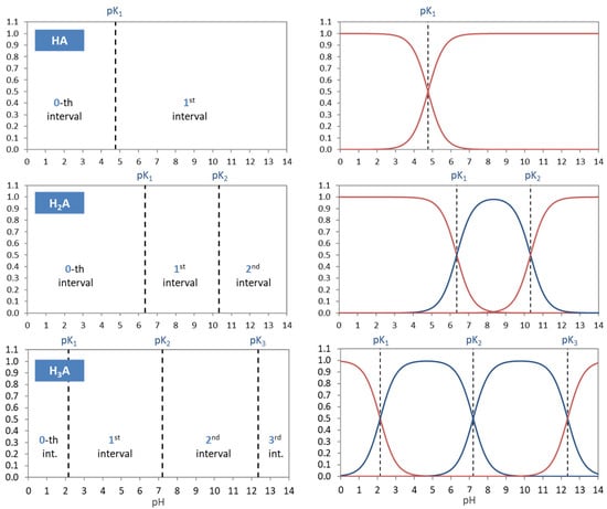 The acidity constants in the form of pKj values subdivide the entire pH domain into N + 1 distinct intervals, as shown in Figure 4. The jth interval is the subdomain in which the ionization fraction aj exercises its full dominance—see right diagrams in Figure 4. As indicated by colors, there are two types of curves: (i) S-shaped curves (sigmoid curves) in the 0th and the Nth interval at the opposite ends of the pH scale (red color) and (ii) bell-shaped curves in all other intervals (blue color), with their maxima in the middle of the interval. [Note 1: For N = 1, a0 and a1 represent prominent functions: logistic functions or the Fermi–Dirac distribution—see Section 2.5.3. Note 2: The S-shaped curves appear as the two halves of a bell-shaped curve when the opposite ends are glued together at ±∞.]