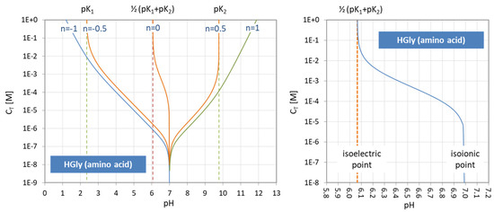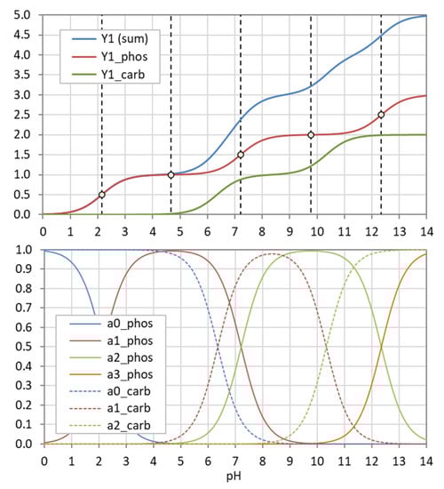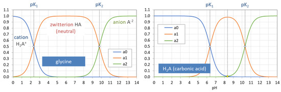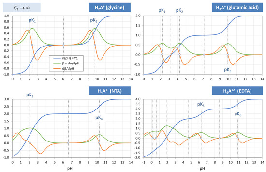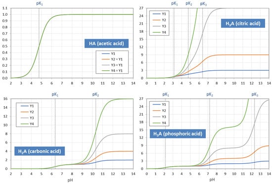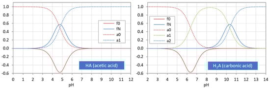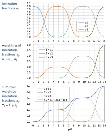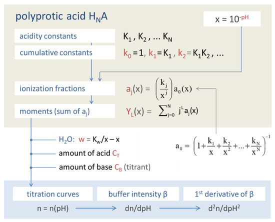 The mathematical description of polyprotic acids (with N ≥ 3) is a special topic that extends the traditional view on acid–base reactions. Algebraic equations are presented in [14,15,16,17,18,19,20]; their application to titration and buffer capacities can be found in [21,22,23,24] and in [25,26,27,28,29,30]. Many of the developments come from areas outside conventional hydrochemistry (e.g., org/bio/med chemistry), which is the playground of proton-binding macromolecules such as nucleic acids and fulvic/humic acids. This also encourages a statistical description [31,32,33,34].
