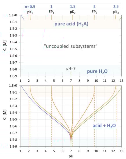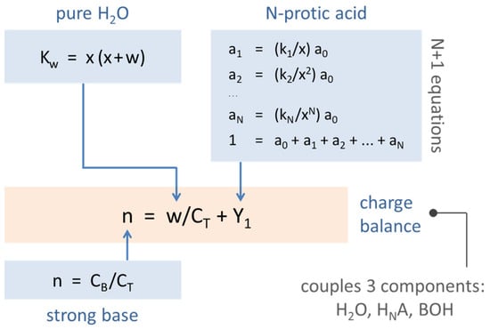 The goal of Section 2 is to bundle a set of N + 3 nonlinear equations into an analytical formula. We start with the 1-component system in Section 2.1, i.e., the N-protic acid itself, which is fully determined by N acidity constants K1 to KN. In Section 2.2, the 1-component system is extended to a 3-component acid–base system, which opens the door to the description of acid–base titrations. After discussion/classification of equivalence points in Section 2.3, buffer capacities and buffer intensities are introduced in Section 2.4. Regarding the connection between the three subsystems in Figure 2, the numbers 1/CT and CB/CT act as “coupling constants” of the acid to the water (autoprotolysis) and to the base. Section 2.5 embeds the present mathematical approach into alternative concepts “outside” traditional hydrochemistry.