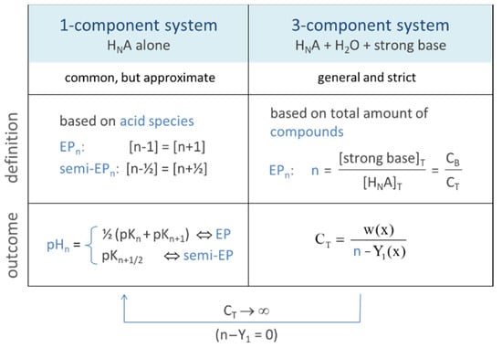 Concerning the equivalence points, there are two sorts of indices, j and n, which originate from two different fields. The integer j is the index that labels all acid-relevant quantities (in the 1-component system): the acid species [ j ], the acidity constants pKj, and the ionization fractions aj. In contrast, the index n is a parameter of the 3-component system that confines the equivalent fraction n = CB/CT to integer and half-integer values. The transformation rule between both index types is simple: