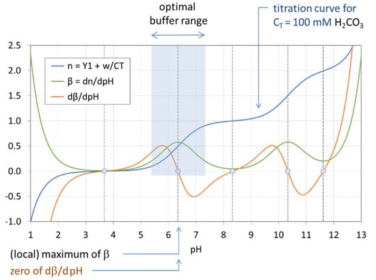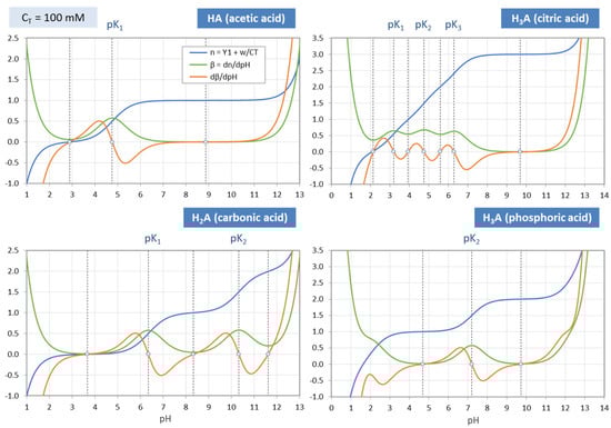 Titration and buffer capacities are summarized in an excellent review article by Asuero and Michałowski [26]. This and other papers [24,25,26,27,28,29,30] rely on association reactions (with reference state A−N), so one has to be careful when comparing the formulas with the present approach. Additionally, most of these papers take the dilution during titration into account by explicitly using the volume of the titrant. This effect is ignored in this review to keep the formulas simple.