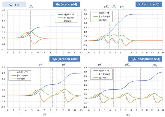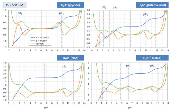 - Asuero, A.G. Buffer Capacity of a Polyprotic Acid: First Derivative of the Buffer Capacity and pKa Values of Single and Overlapping Equilibria. Crit. Rev. Anal. Chem. 2007, 37, 269–301. [Google Scholar] [CrossRef]
