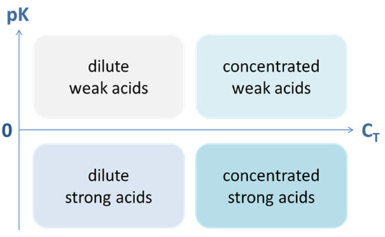 - Pardue, H.L.; Odeh, I.N.; Tesfai, T.M. Unified Approximations: A New Approach for Monoprotic Weak Acid-Base Equilibria. J. Chem. Educ. 2004, 81, 1367. [Google Scholar] [CrossRef]