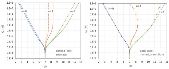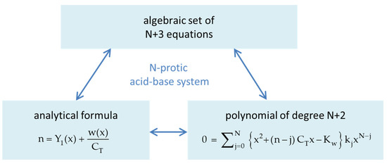 Answer 3. In standard textbooks [1,2,3,4,5,6], an algebraic solution of the acid–base problem is usually provided for diprotic acids (N = 2) in implicit form, namely as a polynomial of degree 4 in x = 10−pH (quartic equation!)—see, e.g., [1] (p. 107) or Equation (46) below. That is the common way to handle the acid–base problem. In the general case of N-protic acids, this procedure leads to polynomials of order N + 2, where, for N > 4, there is principally no algebraic solution (according to the Abel–Ruffini theorem). This dilemma will be avoided in the present approach. However, before we start, let us explain this in another way.