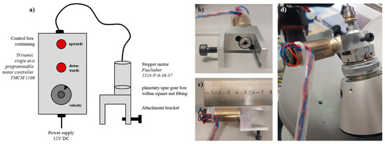 One of the advantages of the goniometer head attachment described above is the simplicity of operation. The set-up is initialized by retracting the height adjustment until the stall guard functionality of the stepper motor controller signals that the end of travel has been reached. A 10-turn potentiometer connected to the analogue input of the controller allows setting the speed of the translational movement over a time range between minutes and hours, while two illuminated push buttons allow the direction of travel to be input.