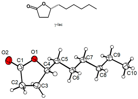 (+)-γ-Decalactone was purchased from Sigma-Aldrich (purity > 97%) and used as received = +41.6 (c 0.087, CHCl3). The liquid compound was crystallized in a capillary with a diameter of 0.3 mm directly (in situ) on the diffractometer (volume of approximately 0.5 µL). The low-temperature phase behavior was established beforehand by differential scanning calorimetry (DSC). Experiments were performed on a METTLER TOLEDO DSC 820 (Mettler-Toledo GmbH, Gießen, Germany). Two cycles with different cooling and heating rates were carried out in the range of −150–+20 °C. The first and second scan employed temperature gradients of 10 and 5 K per minute, respectively.