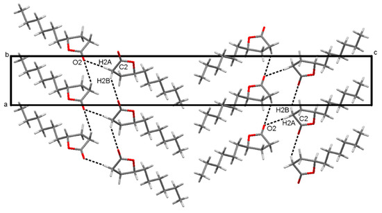The absolute configuration of γ-lac was determined using anomalous dispersion effects. The derived Flack parameter calculated from 717 quotients of Bijvoet pairs according to Parsons’ method (SHELXL) is −0.019(60) and thus the R-configuration is verified (Figure 2). γ-lac consists of a non-polar alkyl chain and a more polar cyclic ester. The polar parts appear to interact via non-classical C-H···O hydrogen bonds involving the carbonyl group of the lactone. The supramolecular structure comprising these intermolecular hydrogen bonds between the polar groups is shown in Figure 3 (numerical values are given in Table 2). In the crystal layers consisting of the non-polar and the polar parts alternate along the c-axis of the unit cell. The structure in solid state appears to be governed by the polar ends of the molecule, since there are no short contacts between atoms in the non-polar region. The five-membered lactone ring adopts an envelope conformation with the apex at C3, which is 0.5 Å above the mean plane (r. m. s. 0.01 Å) formed by the other four atoms of the ring. The ring puckering parameter φ equals 291.8° (see Supplementary Material) [14]. The aliphatic alkyl chain adopts an all-trans conformation in the crystal structure (Figure 2) [15].
