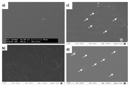 SEM micrographs of the film surface: (a) CF (films without KS), magnification: 200× (b) KSF (films added with KS that was not retained in particles), magnification: 10 kX; (c) NKSPF (films added with NKSP), magnification: 5 kX; (d) AKSPF (films added with AKSP), magnification: 15 kX. Arrows point out NKSP and AKSP particles.