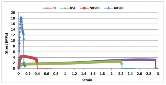 The film resistance to tensile deformation is one of the main properties to be analyzed for the evaluation of material suitability as a packaging. Figure 2 shows the stress versus strain curves of CF, KSF, NKSPF, and AKSPF films after stabilization at 25 °C and 57% R.H. A ductile profile in CF and KSF was observed, common in plasticized biopolymer matrices [20,22]. Both CF and KSF systems developed an analogous plastic deformation showing very high extensibility (≈245%) and stress at break (σb) around 2.6 MPa.