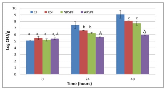 These results indicate that the KS contained in films was available to act as an antimicrobial agent, regardless of the type of starch used for its preparation. However, in the case of AKSPF, a higher antimicrobial efficiency was observed compared to NKSPF, demonstrating better protection and availability of KS in the acetylated starch systems.